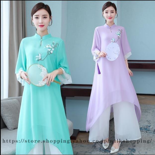 ワンピース チャイナ服 民族衣装風 レディース ロング チャイナドレス 2点セット シフォン 民族風 五分袖 ガウチョパンツ ワイドパンツ 刺繍