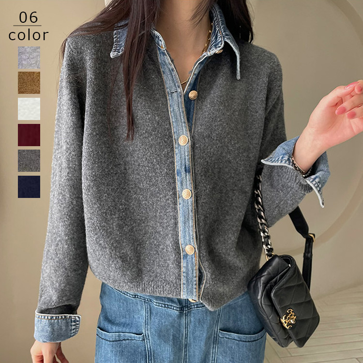 レイヤード風 デニム ニット カーディガン ドッキング 襟付き カジュアル 重ね着風 キレイめ 大人カジュアル 長袖 レディース おしゃれ フリーサイズ 2025秋冬新作 おすすめ