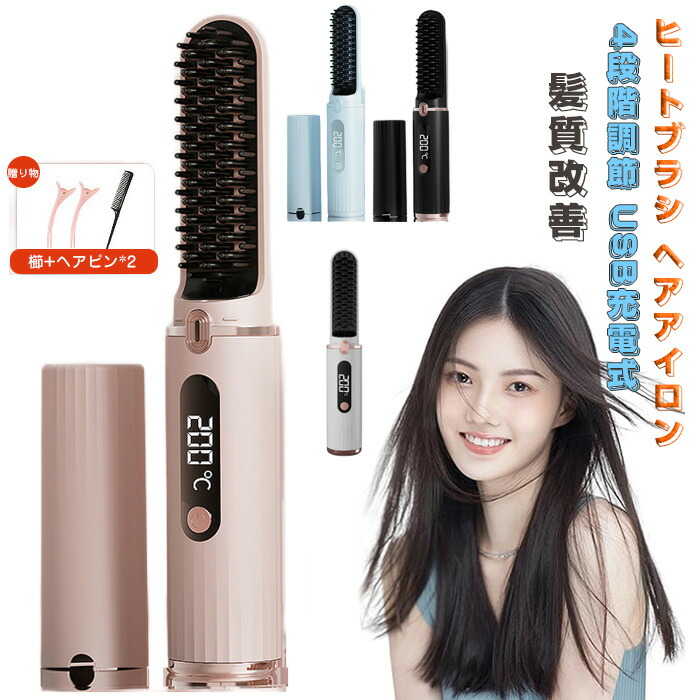 ヒートブラシ ヘアアイロン コードレス ヒートブラシ 充電式 縮毛矯正 髪質改善 4段階温度調節 軽量 コンパクト 15分間自動電源オフ 火傷防止設計 持ち運び ヘアアイロン
