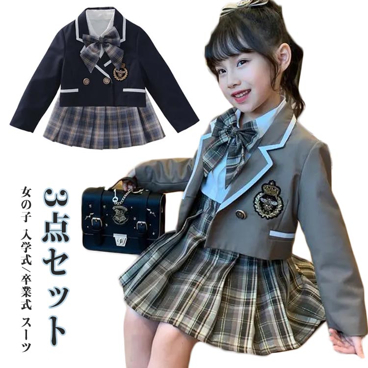 入学式 スーツ 女の子 3点セット 卒園式 リボン付き チェック柄 かわいい フォーマルスーツ 春秋 長袖 セットアップ プリーツスカート 卒業式 ジャケット チェック柄スカート 上下セ 子供