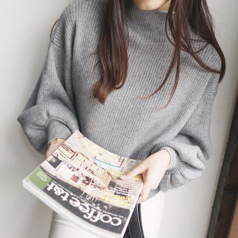 バルーン袖 長袖 レディース ローゲージ リブ バルーンスリーブ 大きいサイズ トップス ゆったり ハイネック 無地ニット タートルネック シンプル きれいめ 20代 30代 韓国ファッション