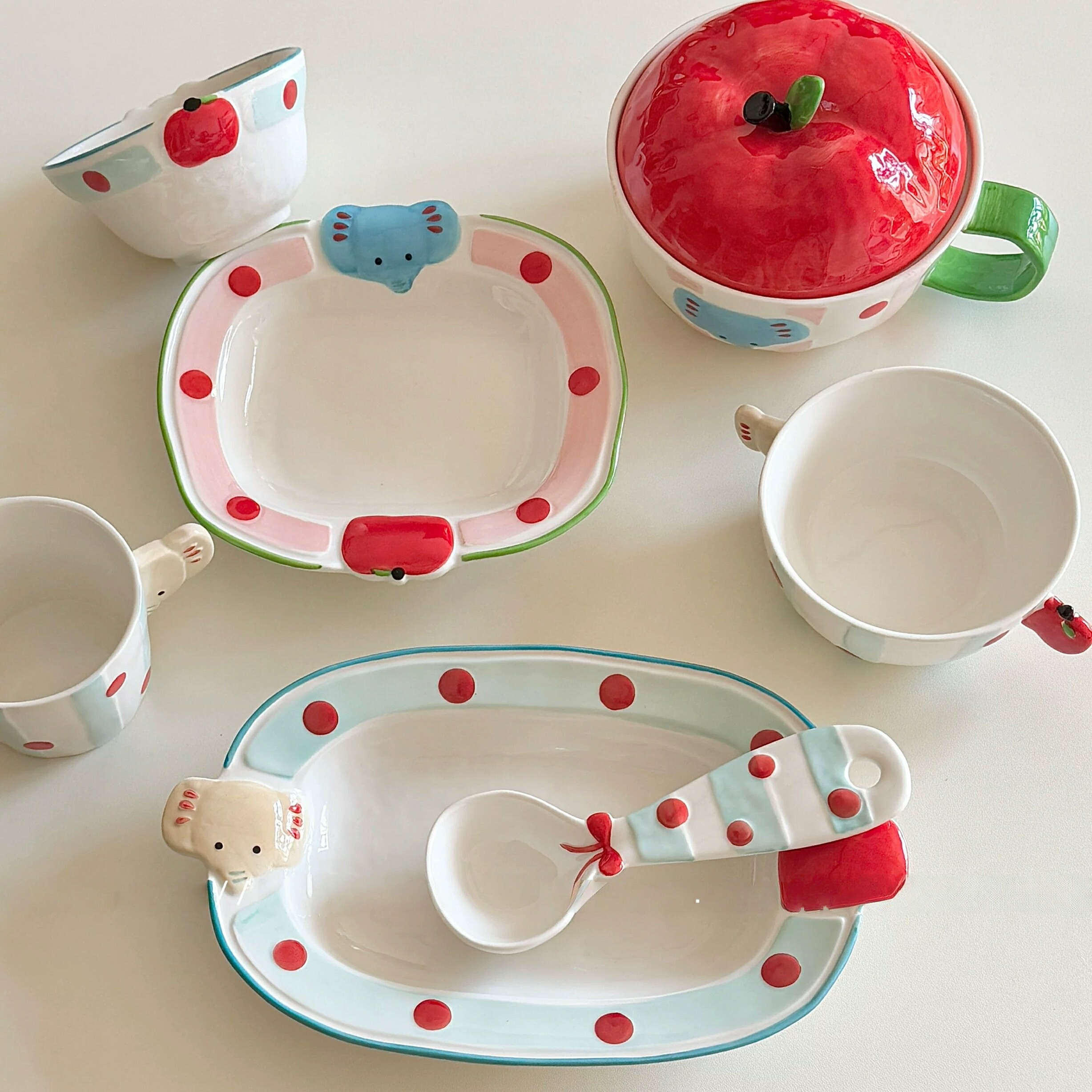 手描き 象柄 食器セット 可愛い 陶磁器 ボウル マグカップ プレート サラダボウル お皿 子供用 大人用 北欧 贈り物 ギフト クリスマスプレゼント 電子レンジ対応 食洗機対応 誕生日プレゼント
