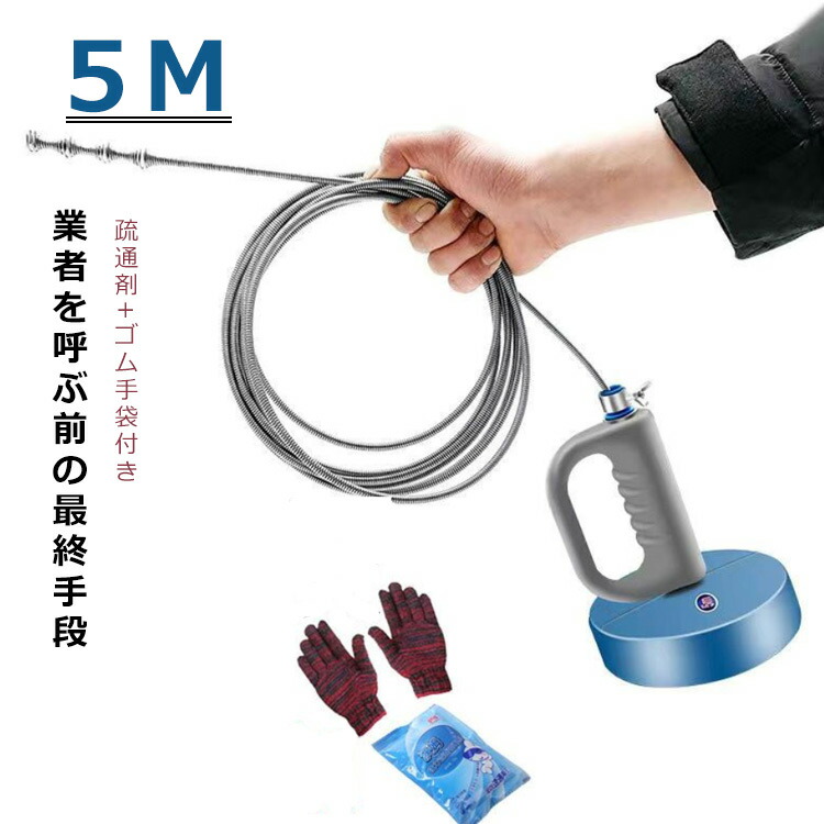 パイプ疏通ツール パイプクリーナー パイプブラシ ワイヤー 5M 回転式 手袋付き 排水溝 疏通剤付き キッチン トイレ 洗面所 家庭用 業務用 詰まり 洗浄 洋式 和式 掃除