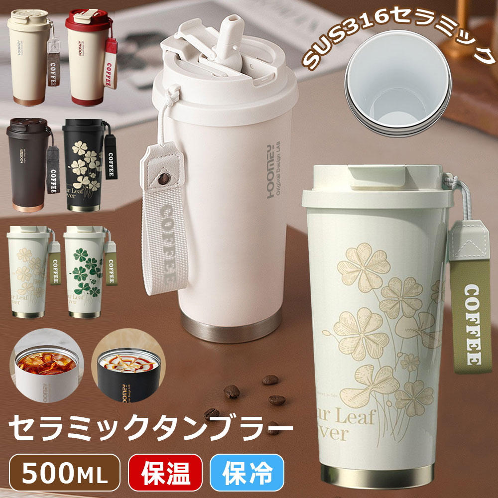 セラミックタンブラー 500ML クローバー柄 タンブラー セラミック 保温 保冷 ストロー付き セラミックコーティング コーヒー 持ち運び 水筒 花柄 マグボトル 漏れない 3WAY 直 こぼれない