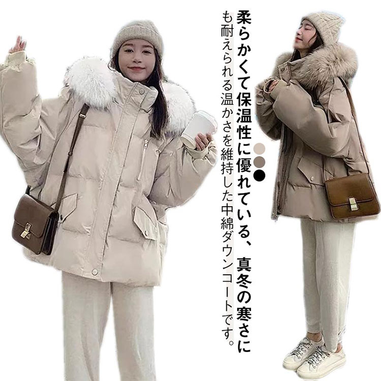 ファー付き ダウンコート コート レディース 冬 ダウンジャケット 中綿ジャケット 中綿コート ミドル丈 ポケット付き ファー 取り外し可能 アウター ジャンパー 前開き 軽量 厚手 暖か ボリューム