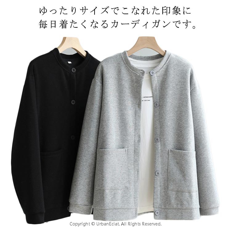 トップス レディース カーディガン クルーネック カーデ 丸首 前開き 長袖 スウェット トレーナー ポケット付き 体型カバー ゆったり 春秋 通学 スクール 学生服 カジュアル