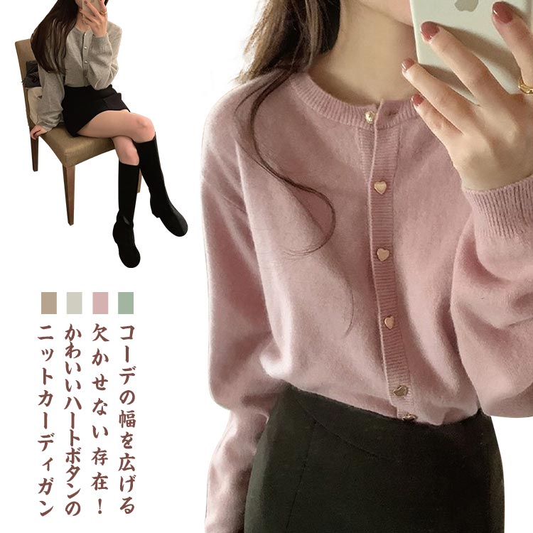 ハートボタン ニットカーディガン レディース 羽織り トップス 長袖 ショート丈 ニットカーデ ボレロ プルオーバー アウター 薄手 ボリューム袖 前開き オフィス きれいめ カジュアル ピン 普段着